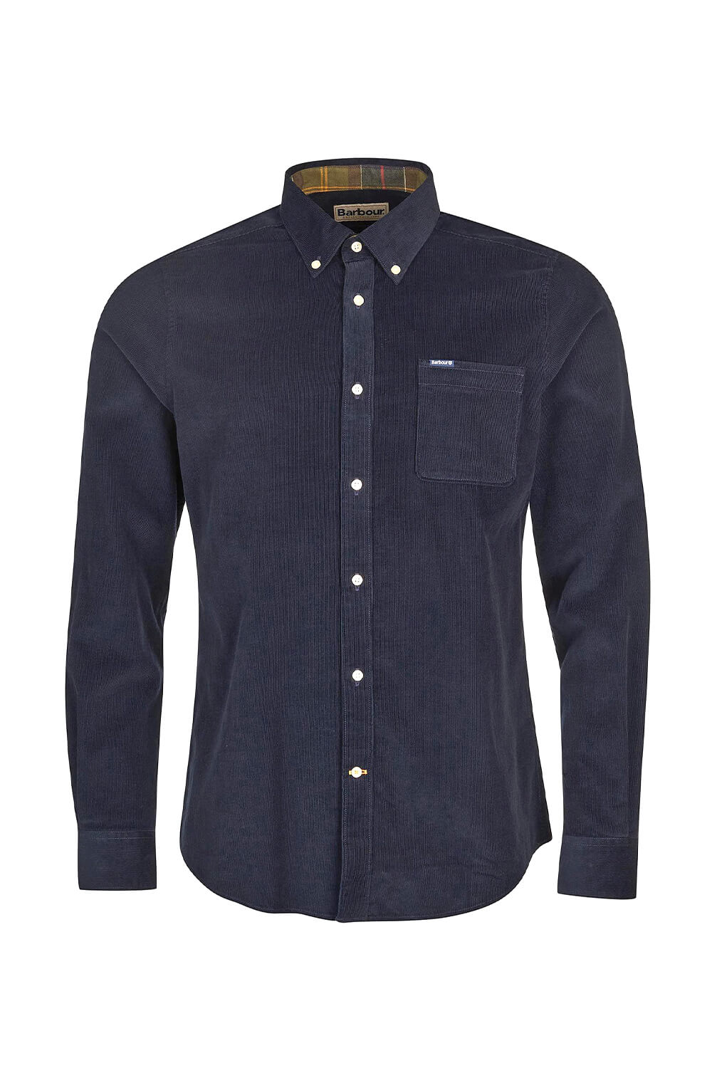 Navy Ramsey shirt from Barbour, made of soft corduroy, it features a button-down collar, a logo label on the chest patch pocket, and long sleeves.