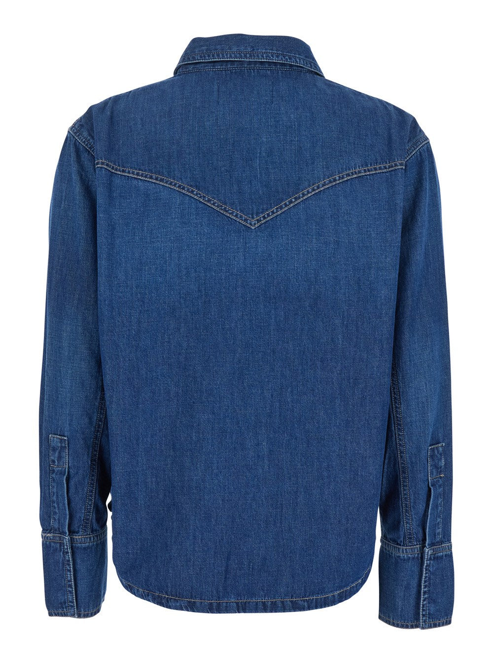 Norah denim jacket shirt from Icon Denim, pointed collar, long sleeves with buttons at the bottom, pointed yoke at the back, front closure with snap buttons, two front patch pockets with flap.