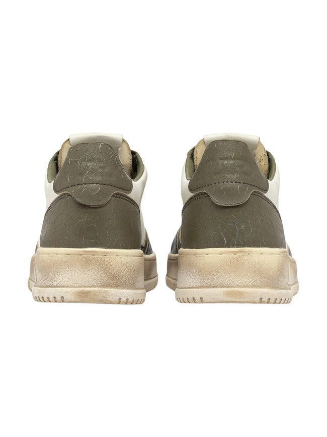 Autry white black and military green sneakers with a vintage effect, a round toe with ventilation holes, cotton laces, a logo on the tongue, a side logo tag, a padded collar, a leather and cotton terry lining, a leather insole with a 2 cm logo, and a 4 cm used-effect rubber sole. Comes with a dust bag.