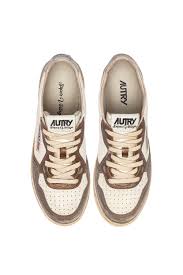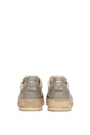 Autry Medalist sneaker in white, bronze, and silver leather, vintage treatment, perforated toecap, cotton laces, embroidered label sewn onto the tongue, leather and cotton terry lining, 2 cm raised leather insole, and rubber outsole.