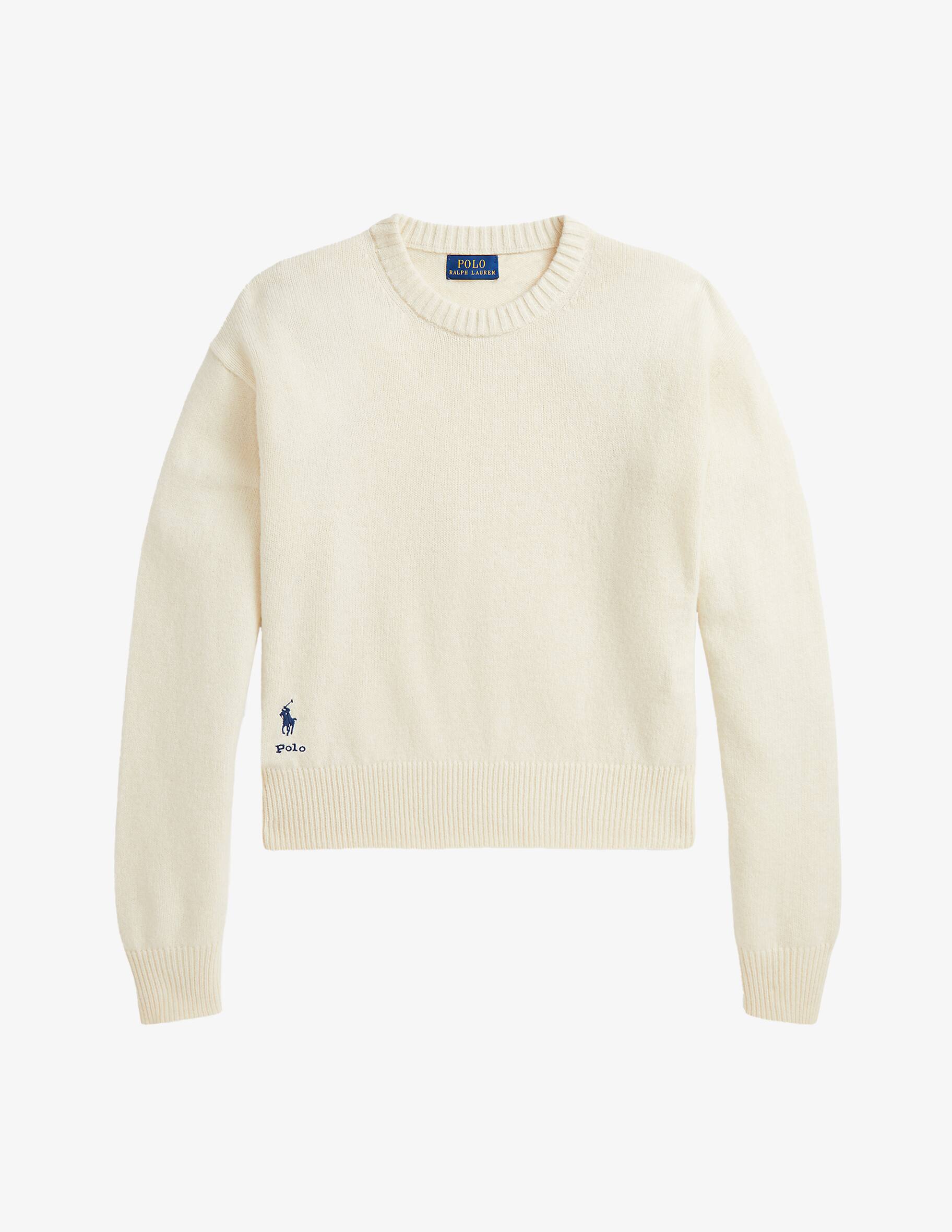 Cream crewneck sweater from Polo Ralph Lauren, straight cut with side slits, long sleeves, ribbed cuffs and hem, exclusive embroidered pony at the bottom of the side.