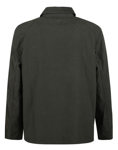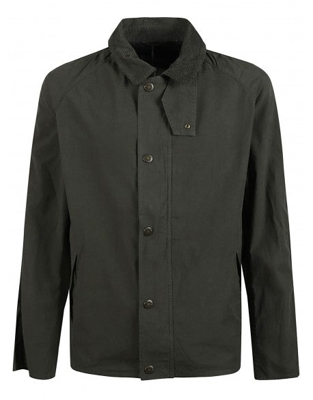 Tracker Casual Jacket n washed olive cotton from Barbour, corduroy collar, zip and snap button fastening, vertical flap pockets, embroidered Barbour logo on the pocket, unlined.