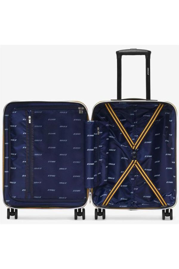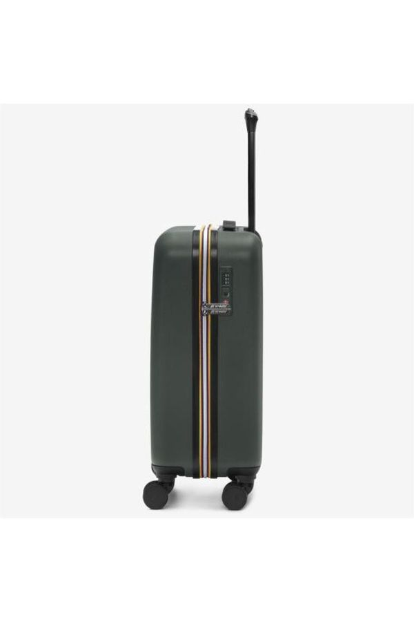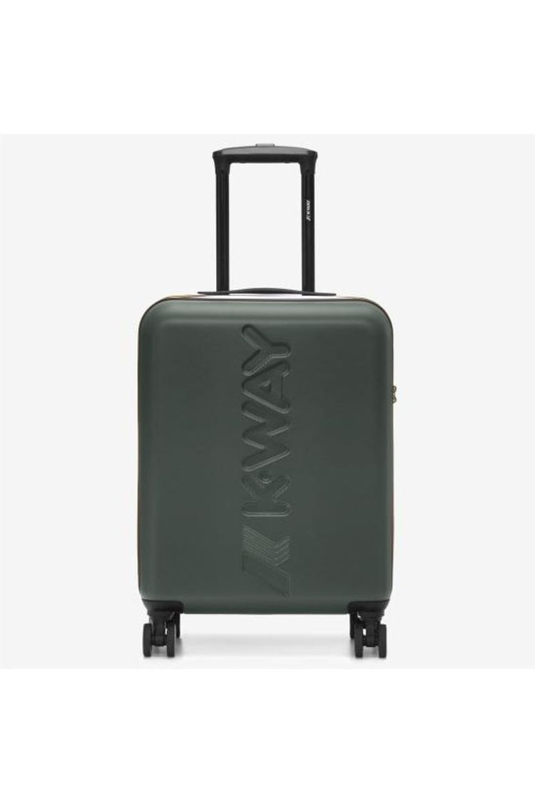 Green Blackish trolley from K-Way,ABS exterior, polyester lining with logo print, three internal pockets with zip, multicolor crossed internal elastic bands,4 personalized double wheels that rotate 360°, customized extendable aluminum handle, combination and TSA locking system, logo printed on the front