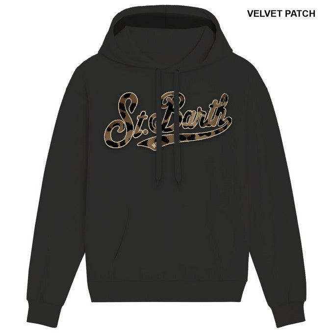 Black St. Barth hoodie with long sleeves, leopard-print logo patch on the front, and ribbed cuffs and hem.