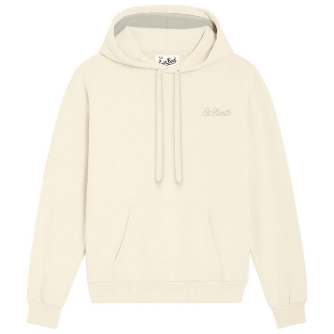 St. Barth milk knit hoodie, long sleeves, ribbed cuffs and hem, and an embroidered St. Barth logo on the chest.